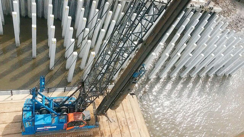 Palen werden geheid vanaf ponton bij een (door getij) sterk wisselende waterstand. (Verschil tussen hoog- en laagtij max 8 meter)